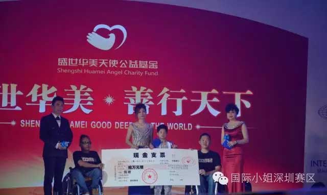 盛世華美天使公益基金自大賽初選開始就一直與參選佳麗共同為慈善公益活動奉獻自己的力量,繼半決賽為變形勵志人那蘇圖現場捐獻十萬元外,本次總決賽現場為殘疾人樂隊林文超損贈十萬元,助力他完成音樂夢想。他對生命的那份執著,對夢想的那份堅持,讓所有人為之動容。