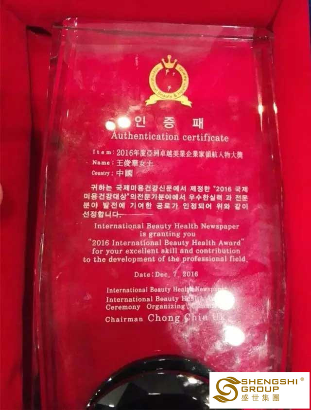 【2016年12月7日】盛世集團(tuán)董事長(zhǎng)王俊華女士榮獲“2016年度亞洲卓越美業(yè)企業(yè)家領(lǐng)航人物大獎(jiǎng)”